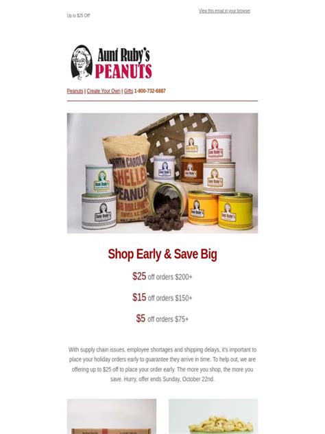 Free standard delivery over $75. Add 3 qualifying items to your cart. Applies to online orders only. Free standard delivery over $75. Enjoy big savings when you purchase on aunt ruby's peanuts online. Use promo code b3g1 at checkout.