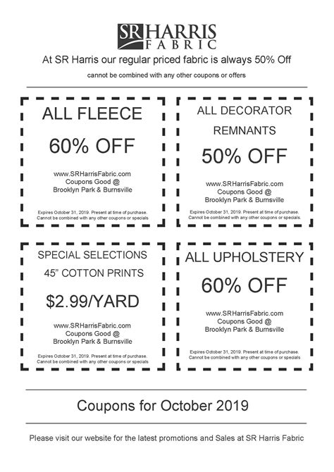 We also have a coupon in the sunday star tribune, in the variety. Keep in mind that this does not apply to notions, trims,. At sr harris fabric warehouse, our fabrics are always 50% off. Web we accept both printed coupons and digital coupons.